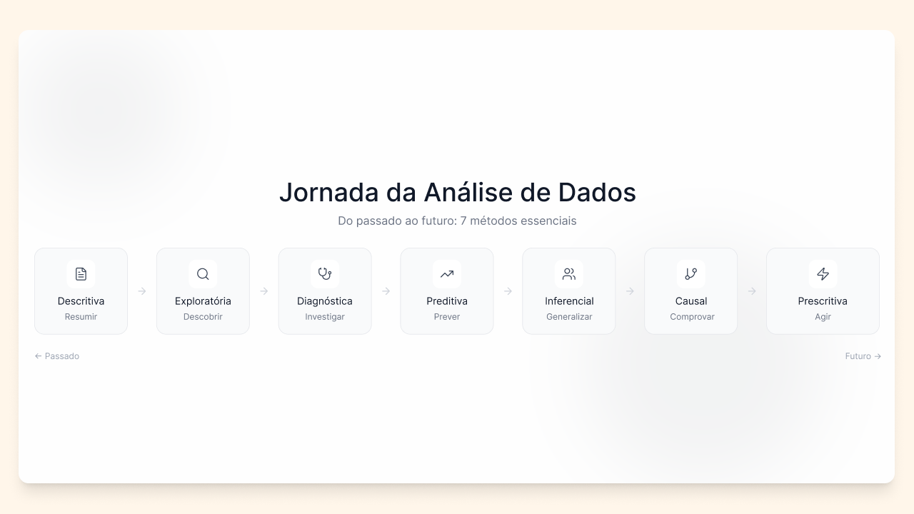 Você não precisa dominar todos os 7 tipos de uma vez. Comece pela análise descritiva, que é a base de tudo — e vá avançando conforme a necessidade. O importante é saber que esses métodos existem e quando cada um faz sentido.